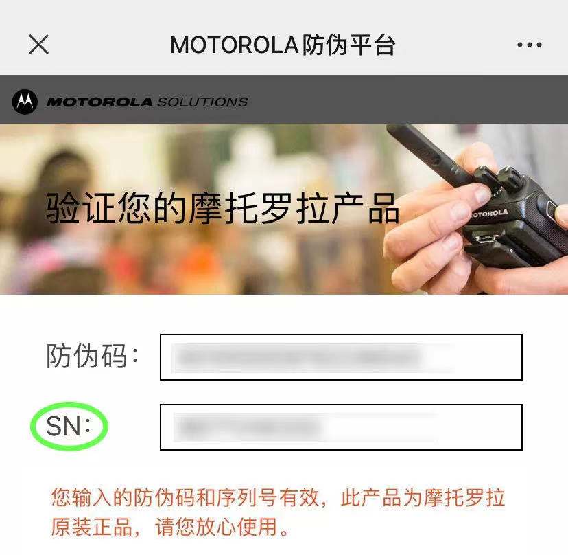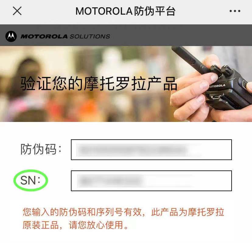 您輸入的防偽碼和序列號有效,此產品為摩托羅拉原裝正品,請您放心使用